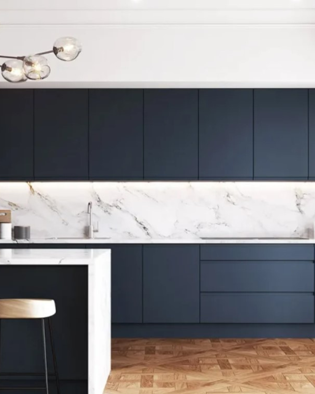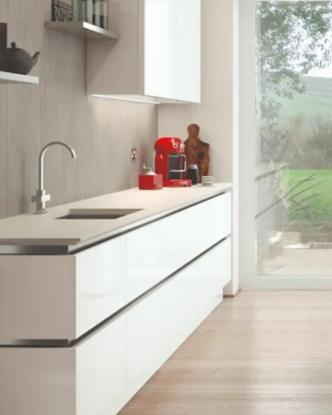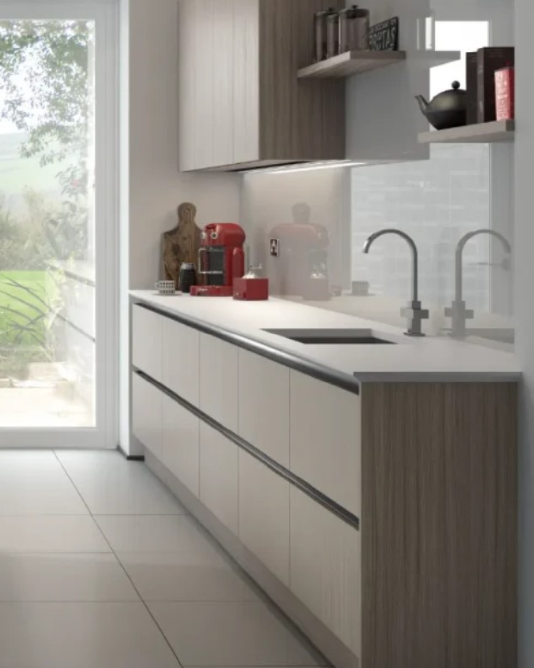 Vero Handleless – The pinnacle of true handleless design, Vero kitchens feature an integrated aluminium rail system, adding a premium, refined touch. This style creates a strikingly modern aesthetic with flawless functionality.