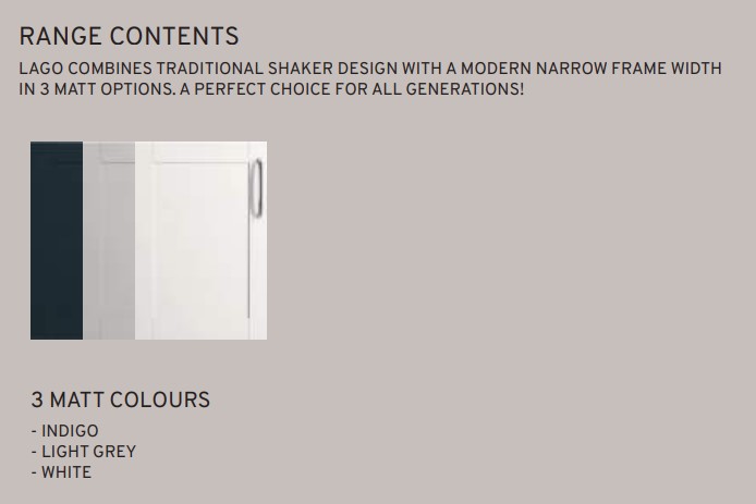 Lago combines traditional shaker design with a modern narrow frame width in 3 matt options. A perfect choice for all generations!