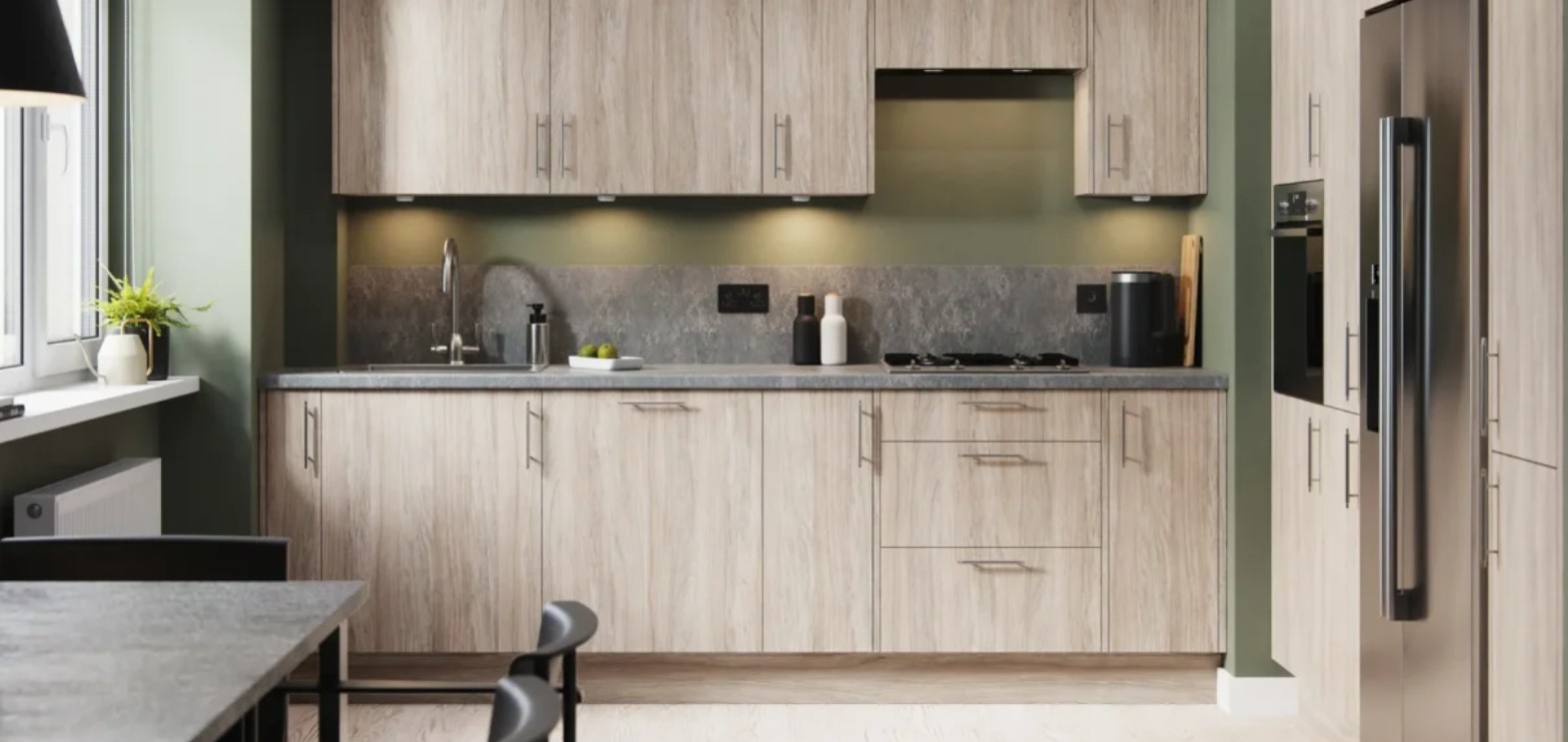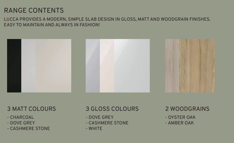 Lucca provides a modern, simple slab design in gloss, matt and woodgrain finishes. Easy to maintain and always in fashion.