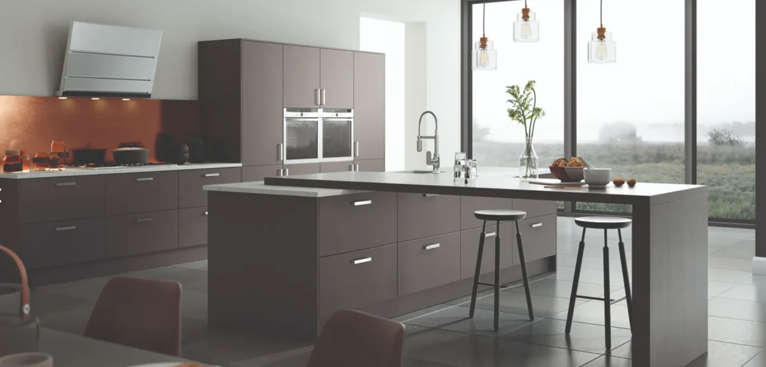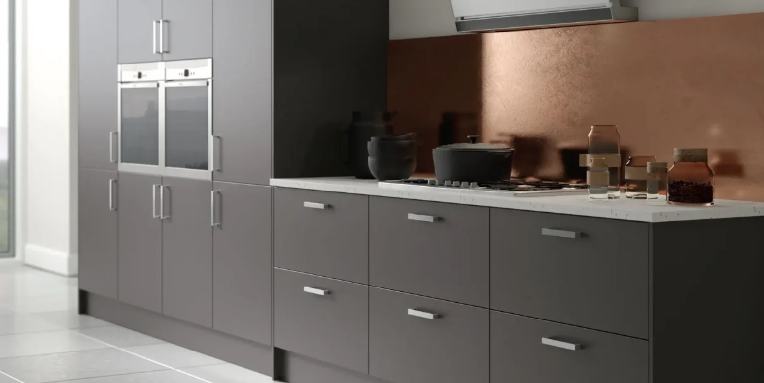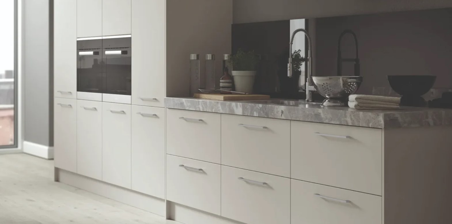 Varano Matt is a lasting, versatile slab door that suits any kitchen, with a tactile finish and full-height larder doors